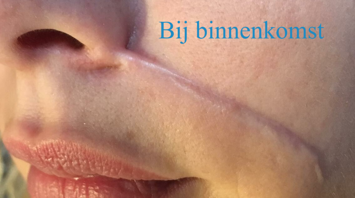 Deze mevrouw heeft een groot litteken in haar gezicht dat ontstaan is medio 2019. Op 20 januari 2020 heb ik haar voor het eerst behandeld. Op 4 juni 2020 heb ik haar voor de 5e keer behandeld. Foto 1 is voorafgaand aan de eerste behandeling gemaakt, foto 2 na afloop van de eerste behandeling en foto 3 na afloop van de 5e behandeling. Het verschil is duidelijk zichtbaar. Het litteken was, voorafgaand aan de eerste behandeling, deels gevoelloos. Na de 5e behandeling is het gevoel in het litteken weer bijna normaal. Dus niet alleen het uiterlijk van het litteken verandert, maar ook het gevoel. Het litteken wordt zachter waardoor ook eventuele pijn verdwijnt.